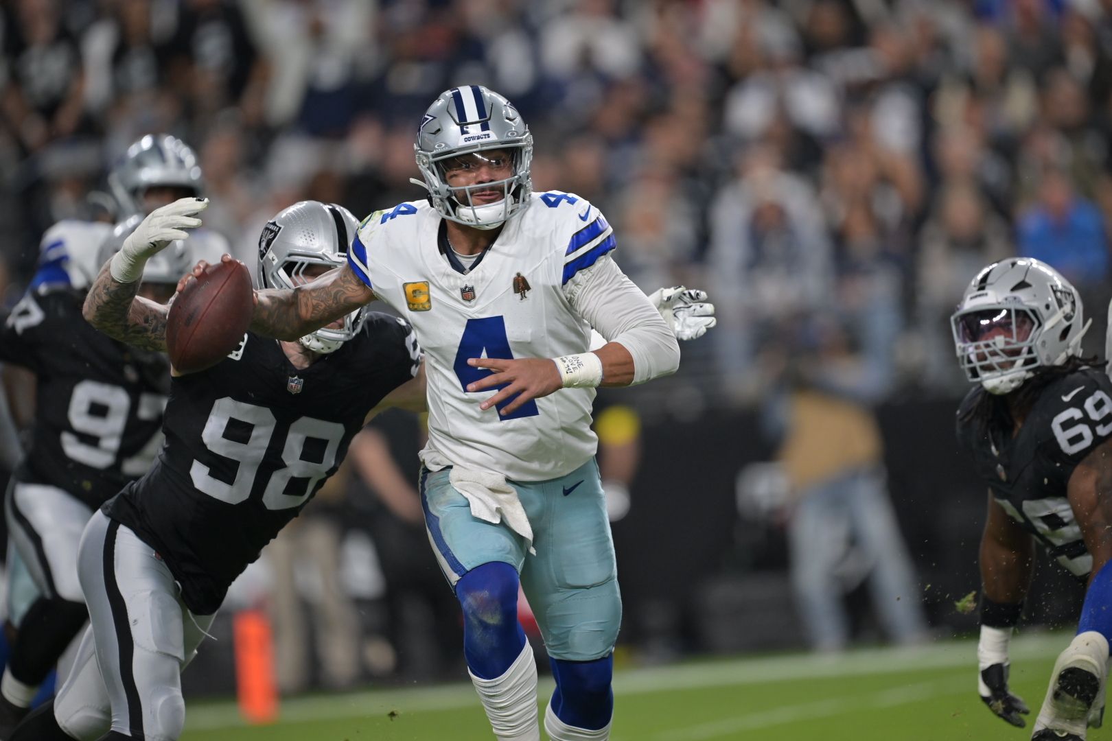 By now, you have seen the phenomenal photos we’ve been using in many of our newsletters. They’re some of the best shots you’ll find of your favorite team, captured through the lens of our friend Arnie Bazemore of Fanshotz.com. Every Friday, we’ll feature Arnie’s favorite Raiders shot of the week that he captures at practice or on game day. This week, we’re featuring a shot Arnie snagged of Maxx Crosby as he chased down Dak Prescott for that strip sack in last week’s game. Check out his work at his site linked above and reach out if you’re interested in working with him. He’s a great guy and has been so supportive of me over the years when I was at NBC here in Vegas, and he’s come along for the ride with Silver & Black Sports Network, too.
