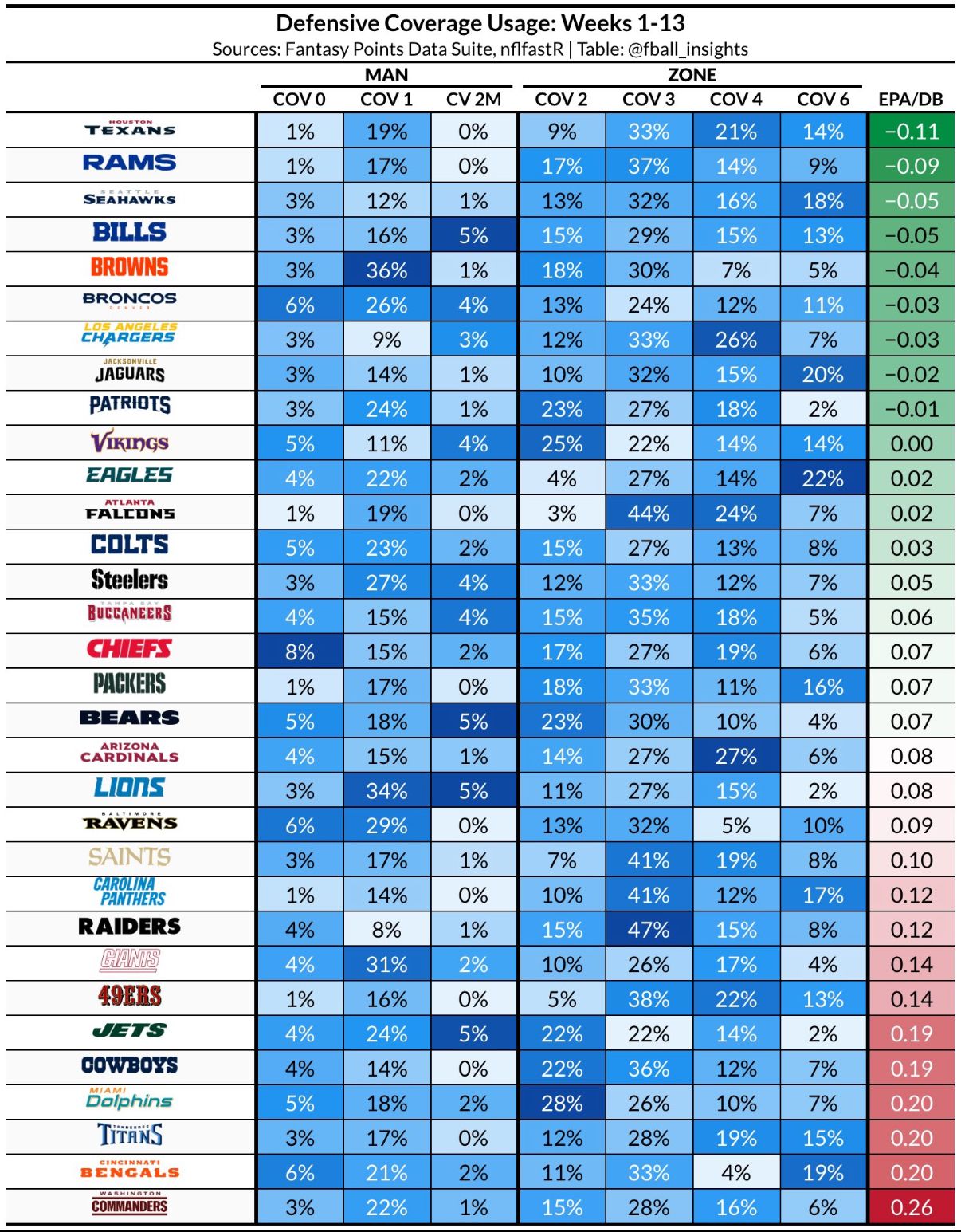 It’s worth noting that Cover 3 remains a common zone coverage look, but the issue is the rate at which poor teams are relying on it. The four teams calling Cover 3 on more than 40 percent of their snaps — the Raiders, Falcons, Saints, and Panthers — are a combined 15–34. That should tell you plenty about why the coverage has fallen out of vogue.